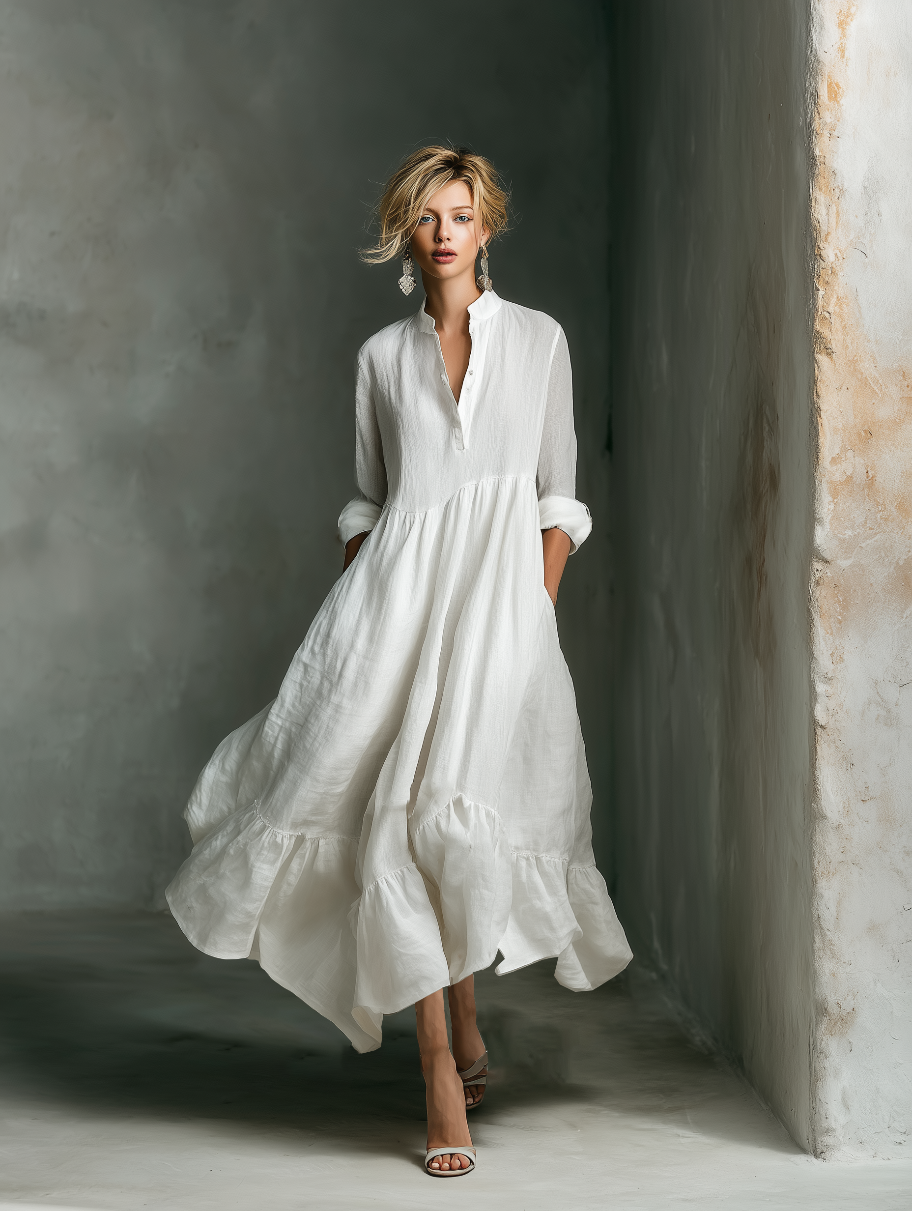 Un vestido largo de color blanco inmaculado con mangas voluminosas y volantes en cascada para un look romántico y vaporoso.